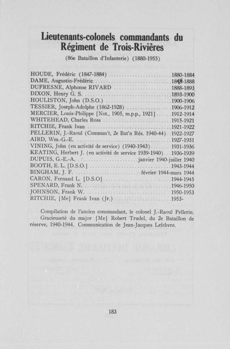 “Lieutenants-colonels commandants du Régiment de Trois-Rivières”TexteBulletin des recherches historiques : bulletin d'archéologie, d'histoire, de biographie, de numismatique, etc. /, 1955-10, Collections de BAnQ.https://numerique.banq.qc.ca/patrimoine/details/52327/2657609Trois-Rivières (avant le 1er janvier 2002)https://troisrivieresnumerique.ca/documents/lieutenants-colonels-commandants-du-regiment-de-trois-rivieres/