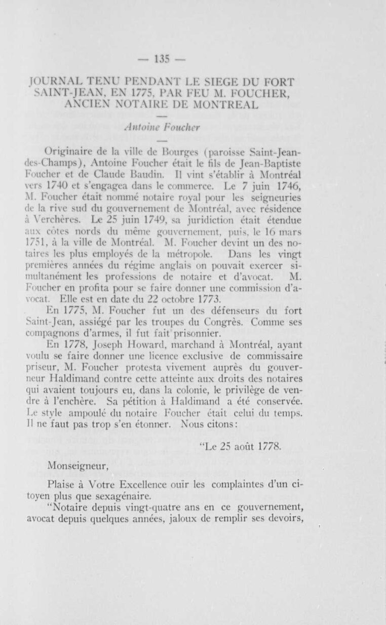 “Journal tenu pendant le siège du fort Saint-Jean, en 1775, par feu M. Foucher, ancien notaire de Montréal”Antoine FoucherTexteBulletin des recherches historiques : bulletin d'archéologie, d'histoire, de biographie, de numismatique, etc. /, 1934-03, Collections de BAnQ.https://numerique.banq.qc.ca/patrimoine/details/52327/2657403Trois-Rivières (avant le 1er janvier 2002)https://troisrivieresnumerique.ca/documents/journal-tenu-pendant-le-siege-du-fort-saint-jean-en-1775-par-feu-m-foucher-ancien-notaire-de-montreal/