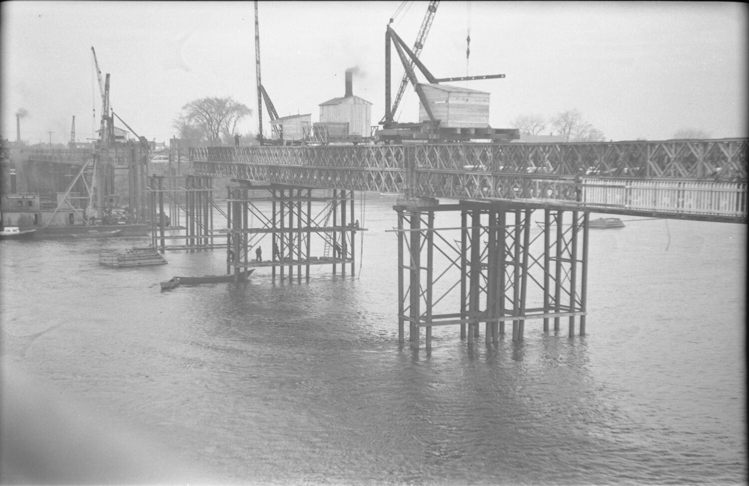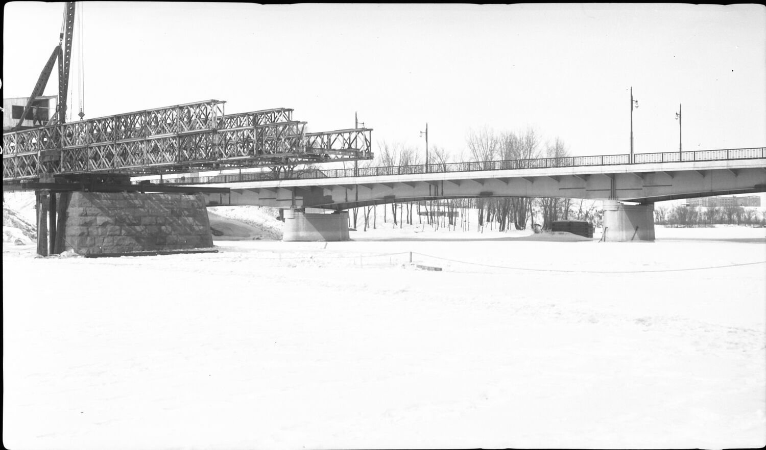 Arrivée des poutres de béton précontraint pour la construction du pont Cloutier reliant l'Île …