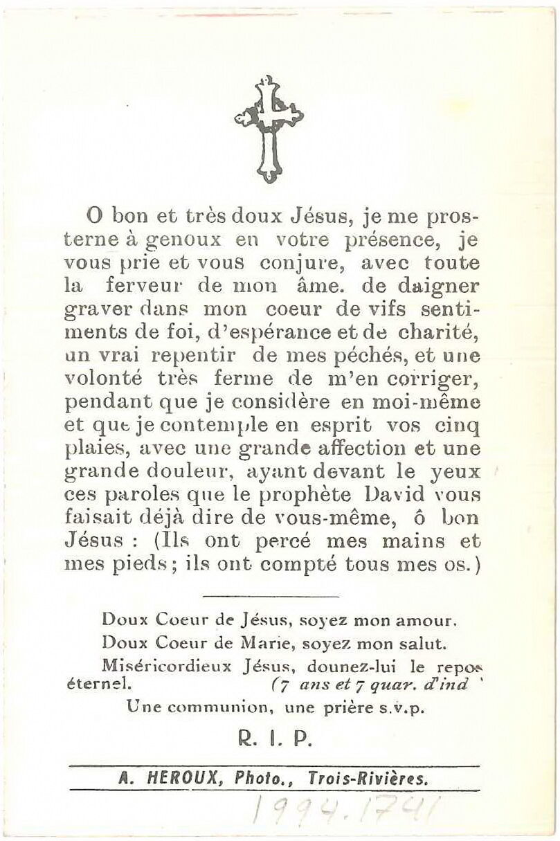 Le verso contient une prière adressée à Jésus, ainsi qu’une mention invitant à offrir une communion ou une prière en mémoire du défunt.