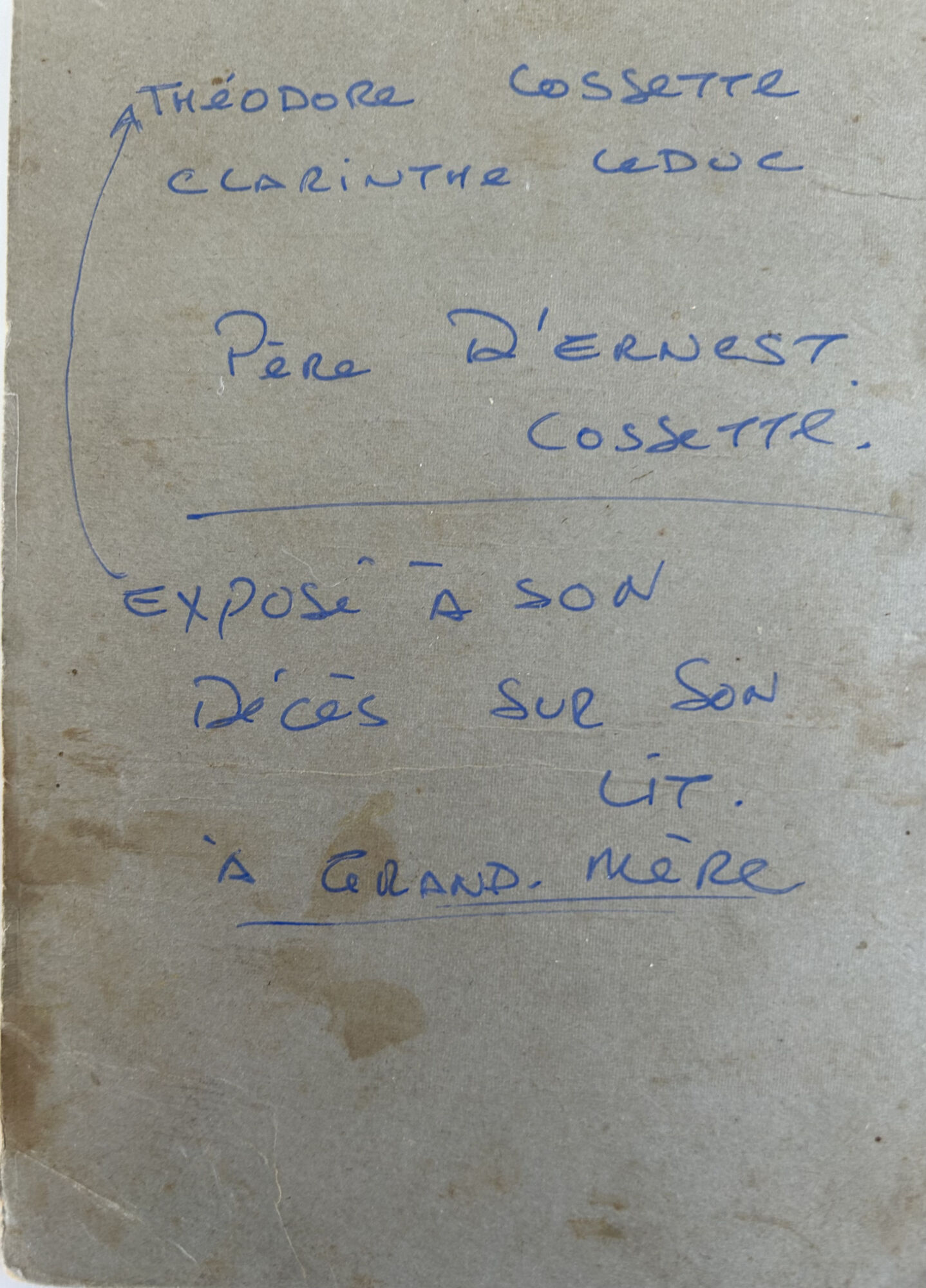 "Théodore Cossette, Clarinthe Leduc. Père d'Ernest Cossette. Exposé à son décès sur son lit à Grand Mère"