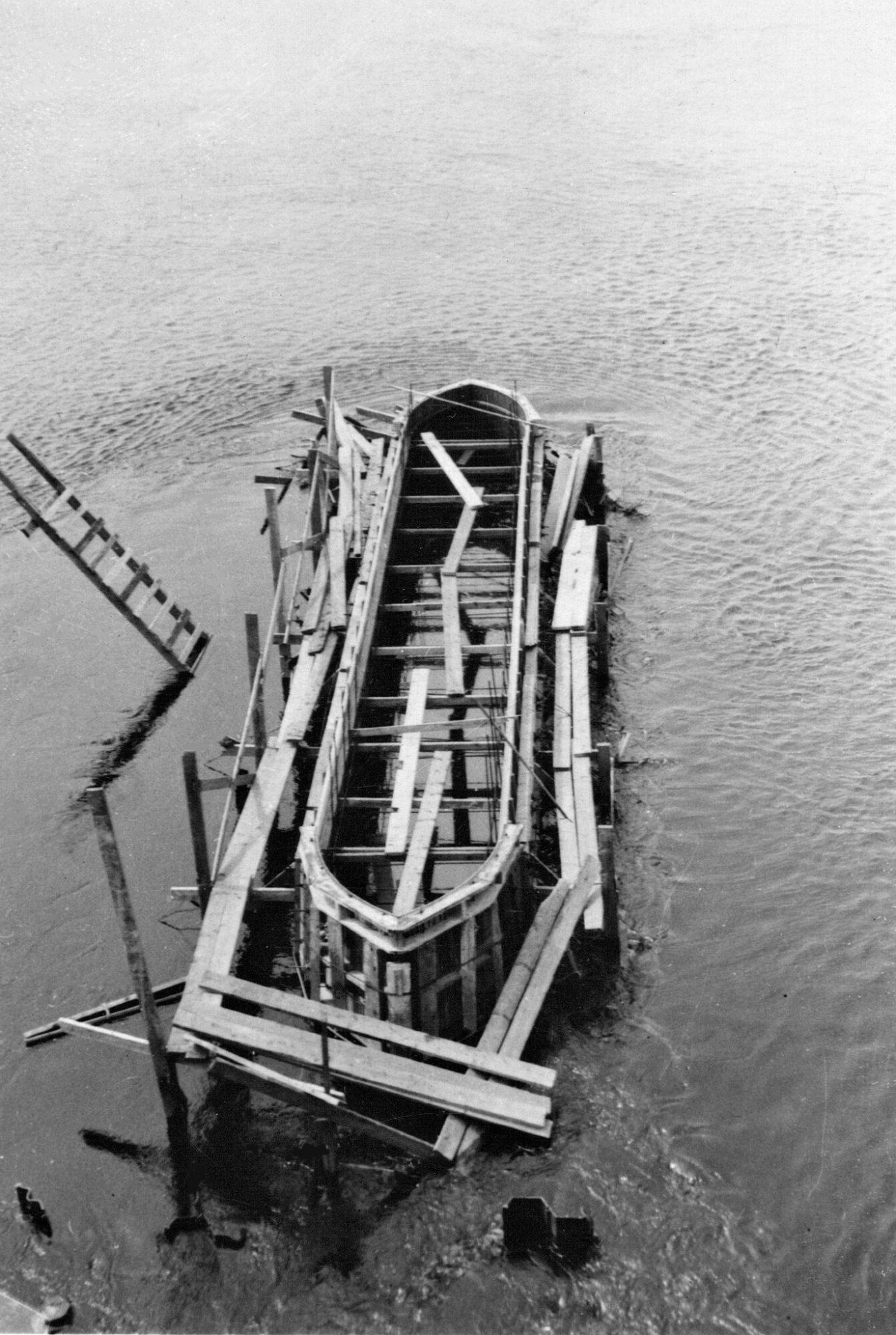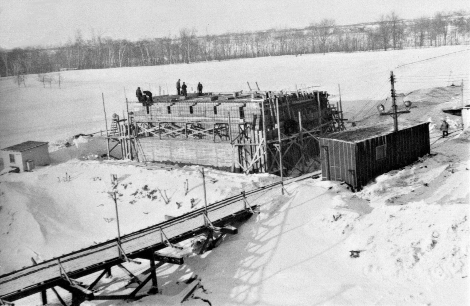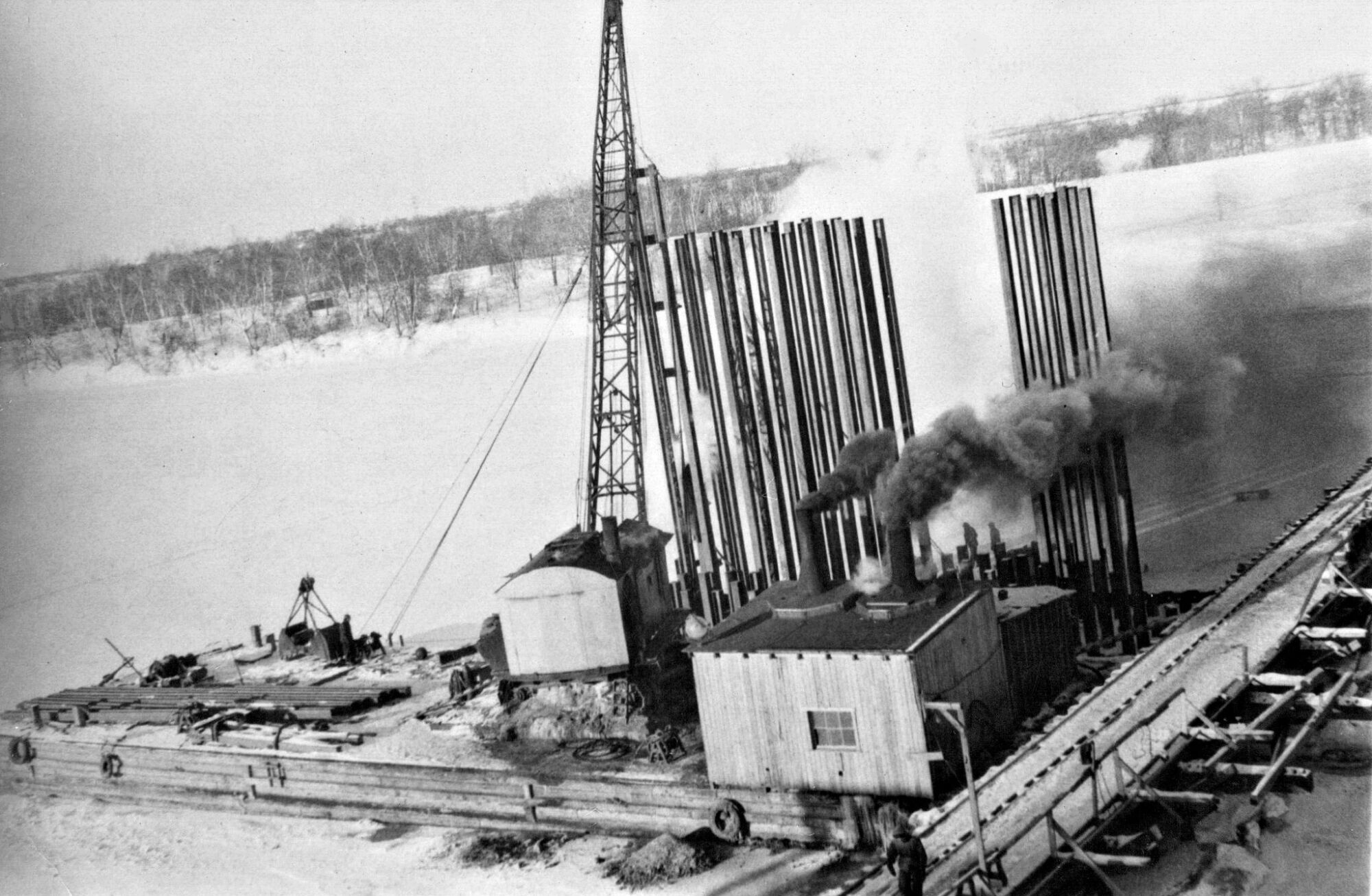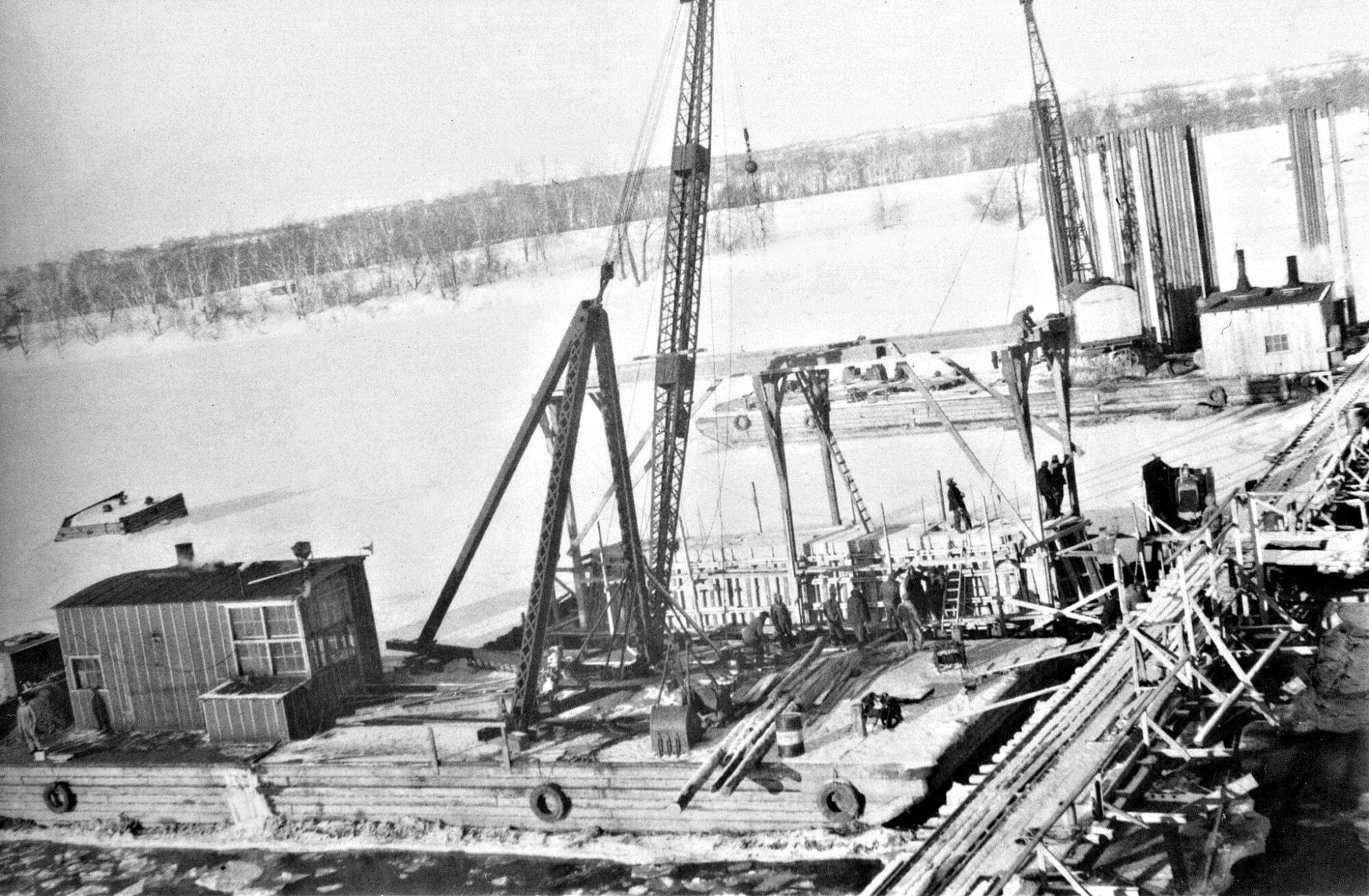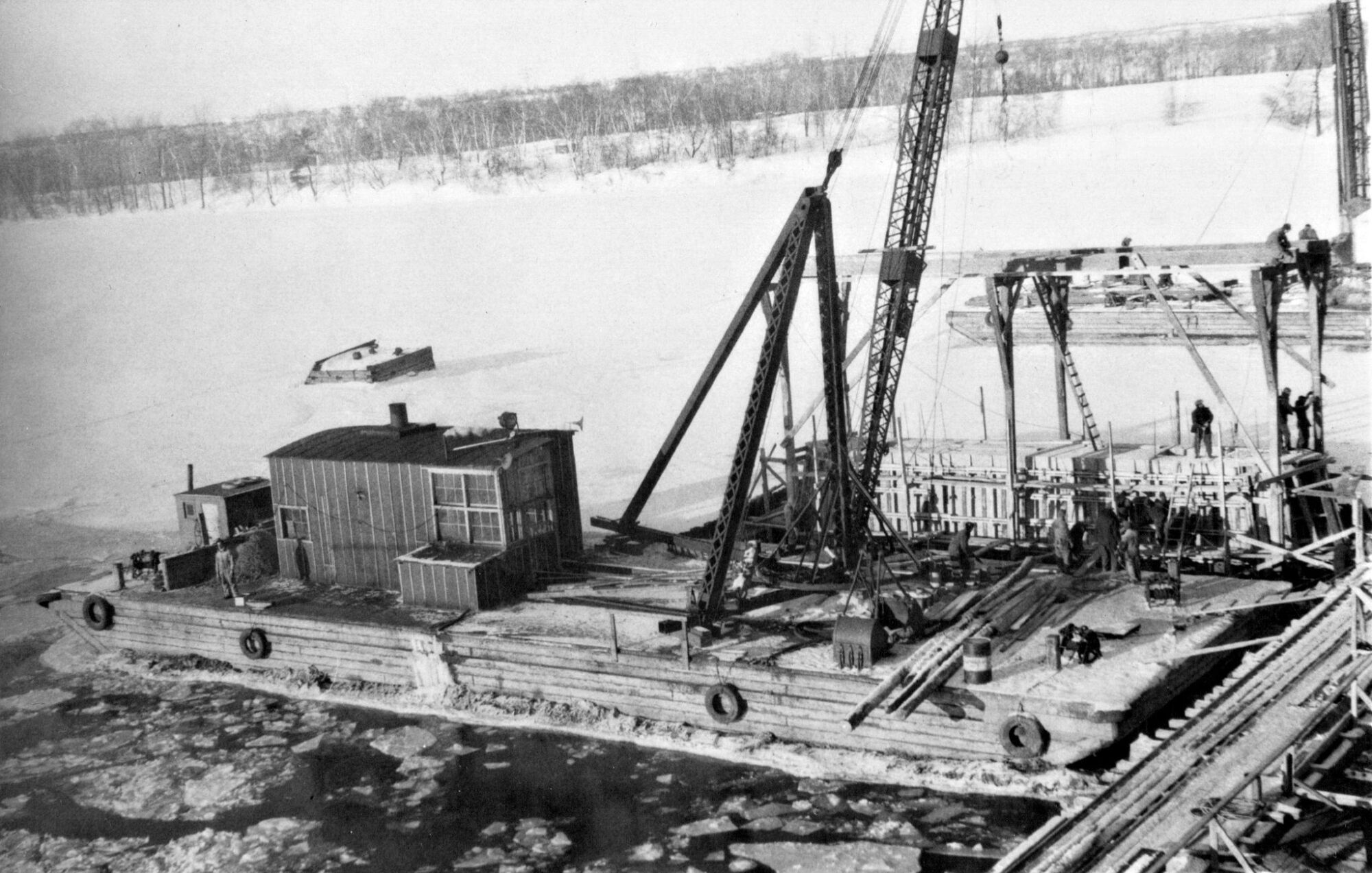 Douze photos représentant la construction du premier pont Duplessis entre Trois-Rivières et Cap-de-la-Madeleine, dont la troisième photo d'un moule pour piliers.