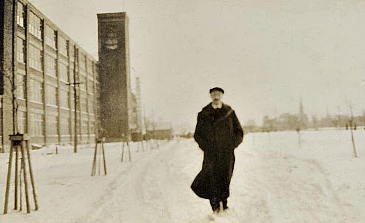 Titre anglais: Man walking beside Wabasso Cotton Company in winter.