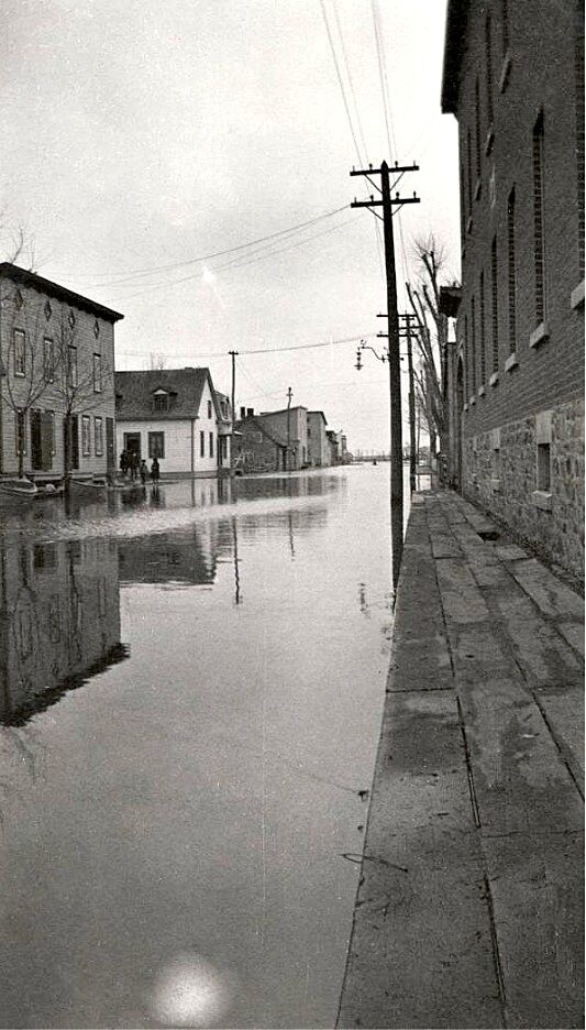 Inondation printanière due aux embâcles, rue Royale, entre St-Roch et Bureau. À droite, l'école Sainte-Angèle.