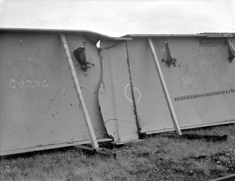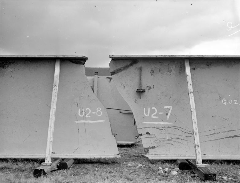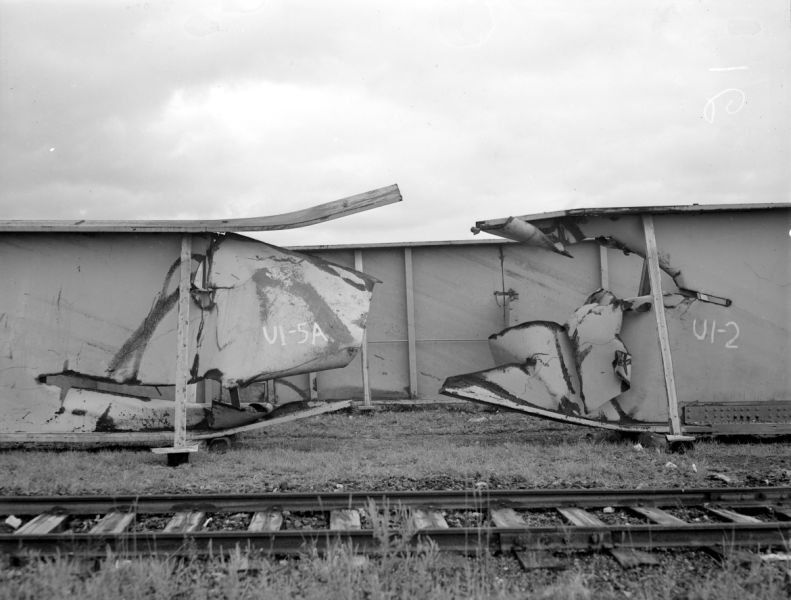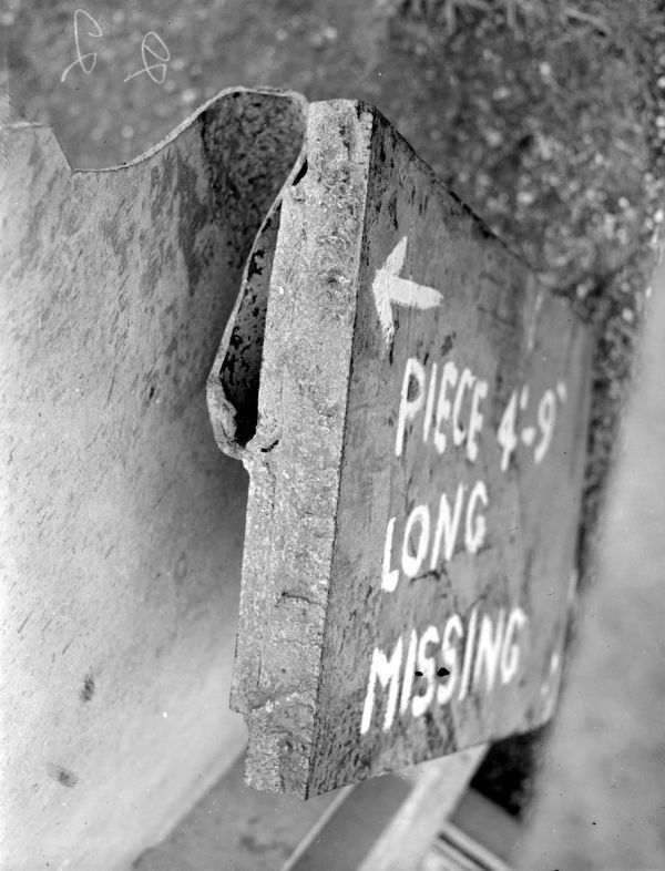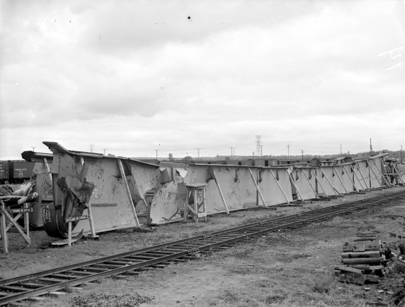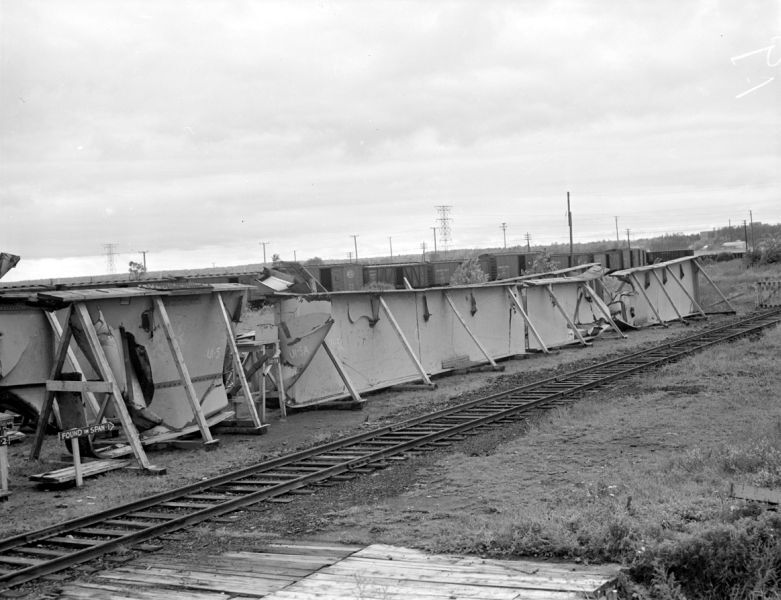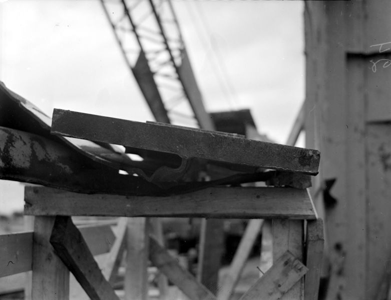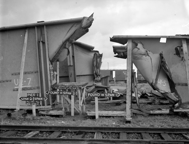 "Il s'agit des débris de l'effondrement du pont Duplessis reliant Trois-Rivières et Cap-de-la-Madeleine, assemblés au terrain de la Commune à Trois-Rivières, de manière à reconstituer la portion écroulée du pont. Nous remarquons des parties de travées et des rails . Les scènes ont été photographiées pour le Service des ponts du ministère des Travaux publics".