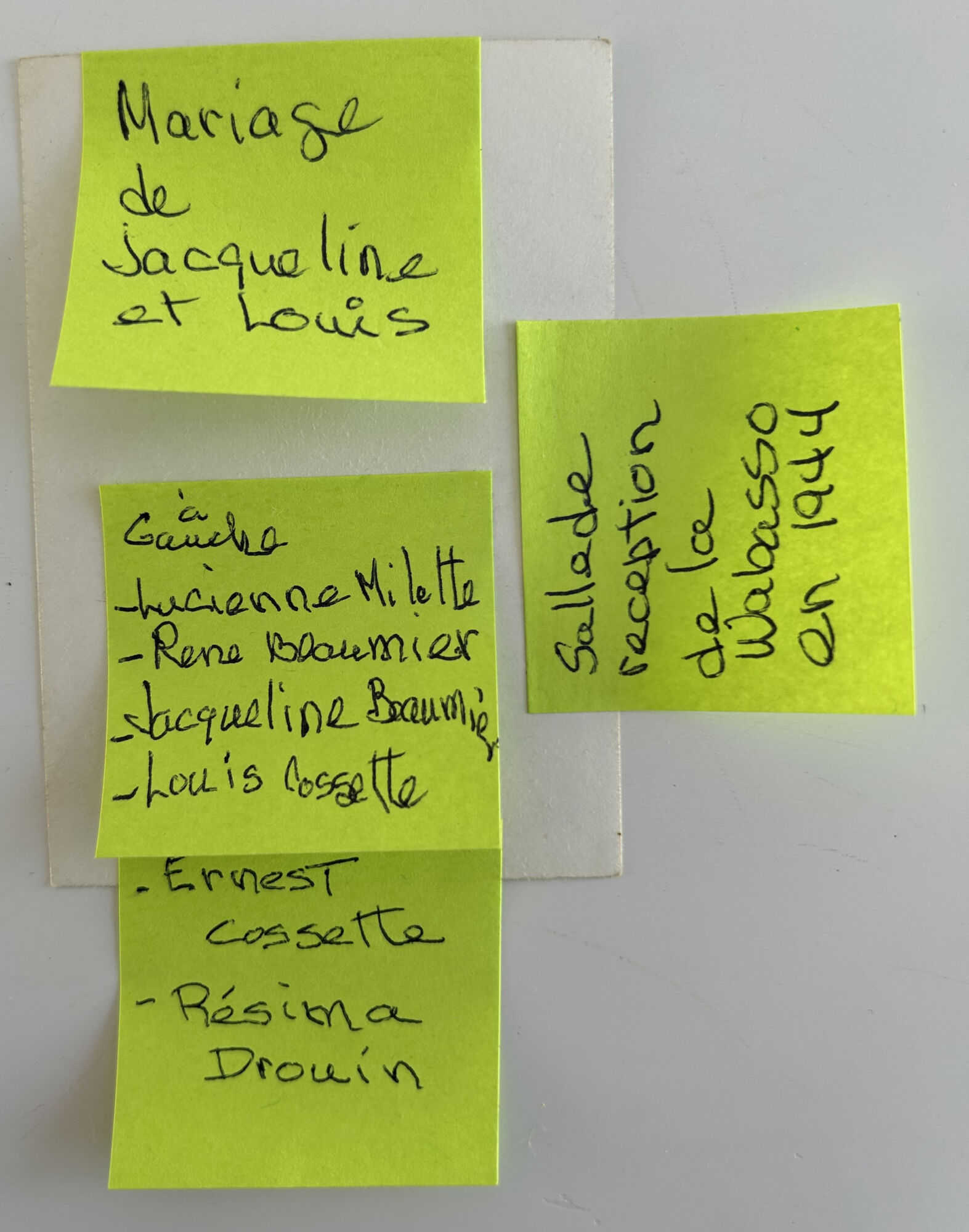 "Mariage de Jacqueline et Louis. À gauche - Lucienne Milette - René Beaumier - Jacqueline Beaumier - Louis Cossette - Ernest Cossette - Résima Drouin. Salle de réception de la Wabasso 1944".