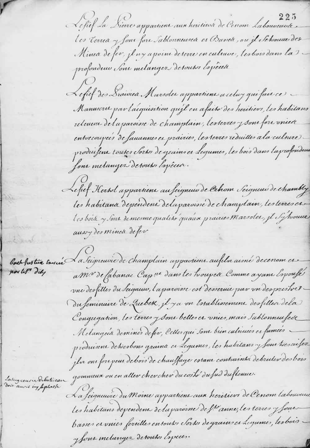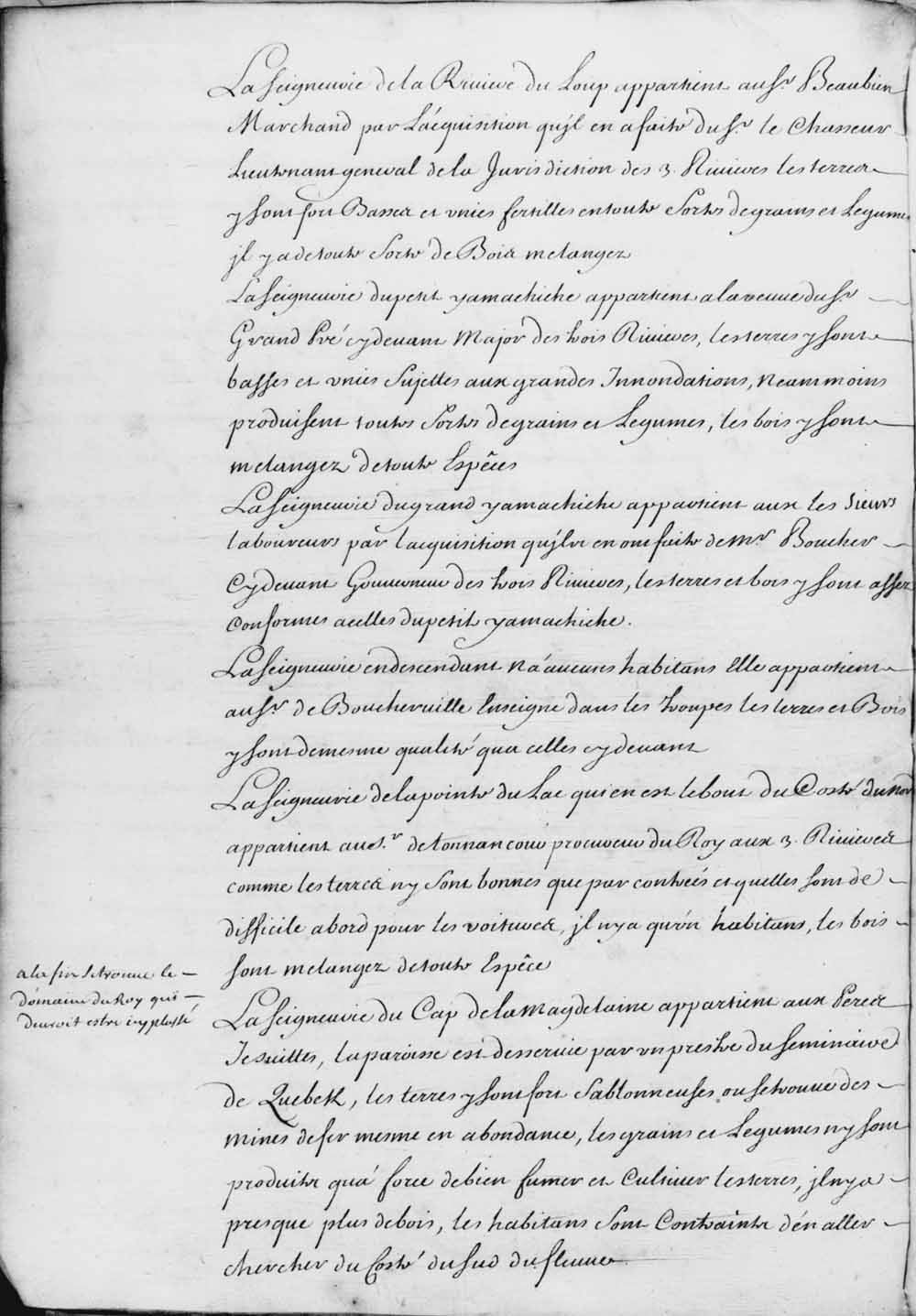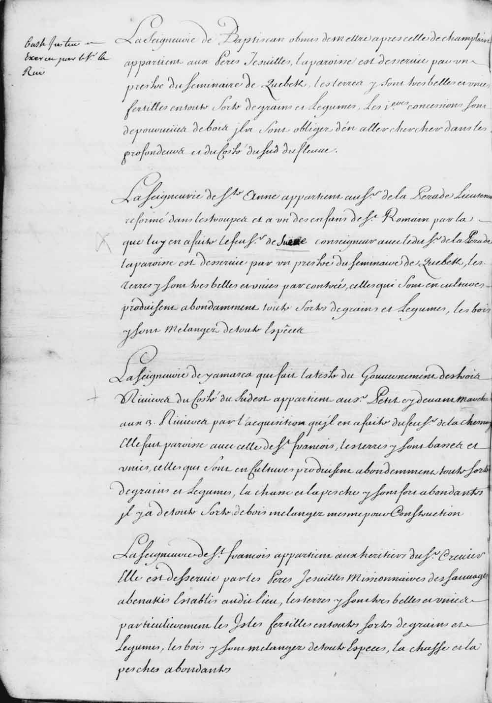 Extrait du manuscrit du « Mémoire de Gédéon de Catalogne sur le Canada », complété le 7 novembre 1712, lequel accompagne les plans de Catalogne de 1709. Catalogne y décrit les trois gouvernements de Montréal, Trois-Rivières et Québec, dans cet ordre, et chacune des seigneuries qui les composent. Ce mémoire est conservé aux Archives nationales d’outre-mer en France, le manuscrit est disponible en ligne dans le projet « Archives de la Nouvelle-France », folios 224-226V et 235V-236.