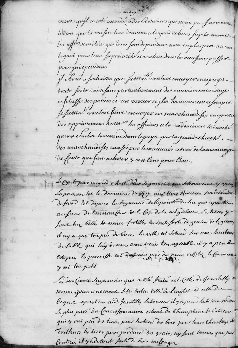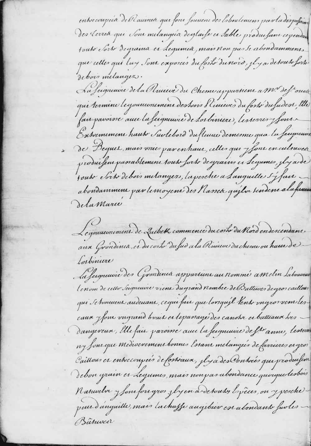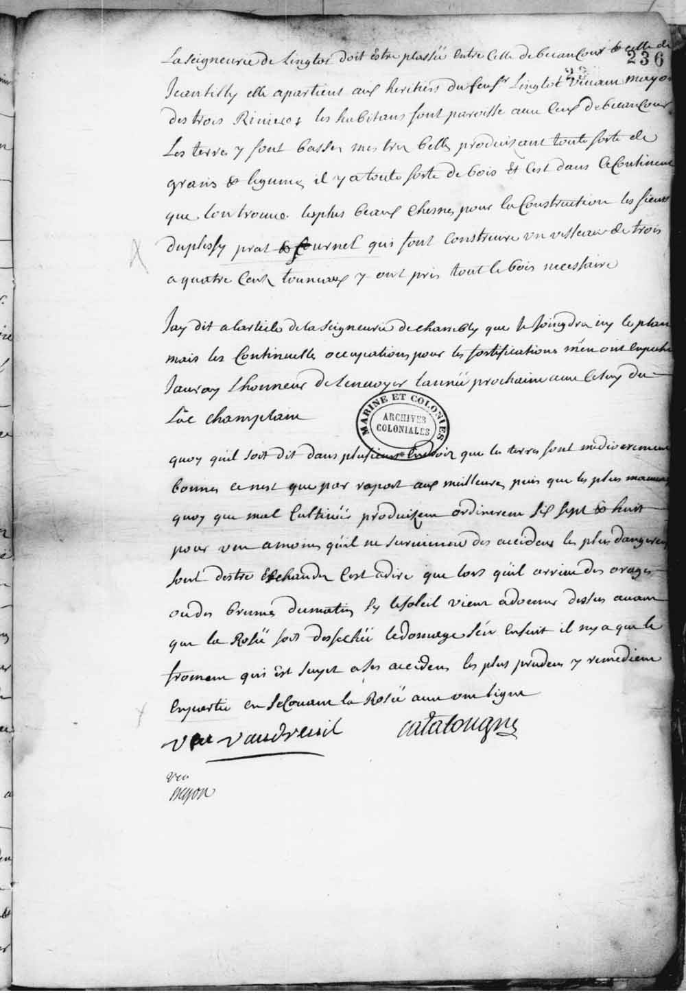Extrait du manuscrit du « Mémoire de Gédéon de Catalogne sur le Canada », complété le 7 novembre 1712, lequel accompagne les plans de Catalogne de 1709. Catalogne y décrit les trois gouvernements de Montréal, Trois-Rivières et Québec, dans cet ordre, et chacune des seigneuries qui les composent. Ce mémoire est conservé aux Archives nationales d’outre-mer en France, le manuscrit est disponible en ligne dans le projet « Archives de la Nouvelle-France », folios 224-226V et 235V-236.