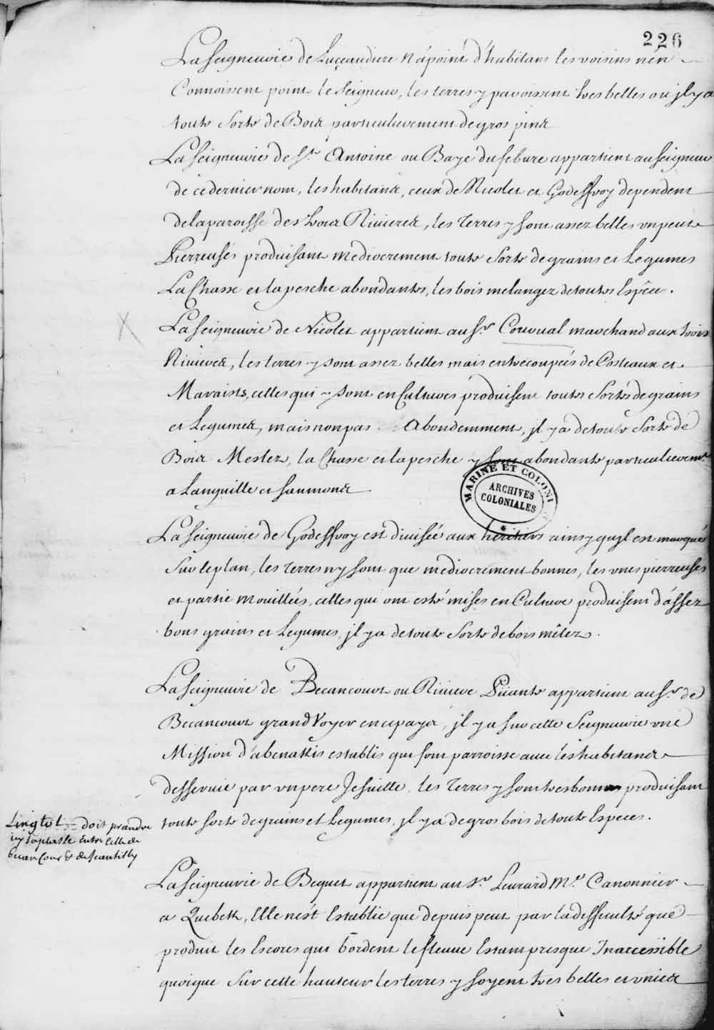 Cet extrait donne la totalité du gouvernement des Trois-Rivières. Les seigneuries de Pointe-du-Lac et du Cap-de-la-Madeleine sont au folio 224V, le fief Lapierre au folio 225, et la ville de Trois-Rivières au folio 235V.