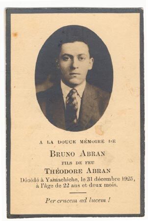 Carte mortuaire à la mémoire de Bruno Abran, accompagnée du portrait photographique du défunt …