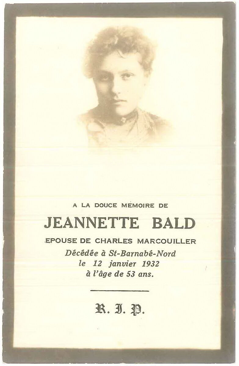 Carte mortuaire à la mémoire de Jeannette Bald, accompagnée du portrait photographique de la …