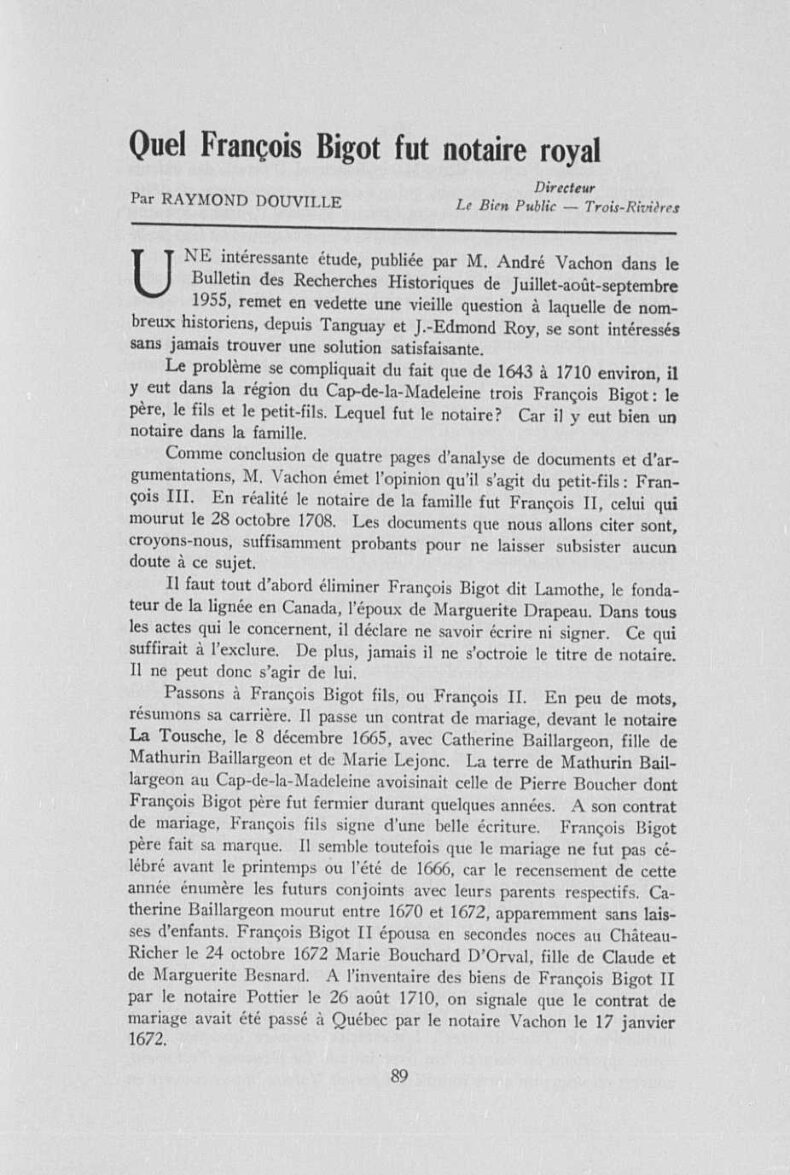 “Quel François Bigot fut notaire royal”Raymond DouvilleTexteBulletin des recherches historiques : bulletin d'archéologie, d'histoire, de biographie, de numismatique, etc. /, 1956-04, Collections de BAnQ.https://numerique.banq.qc.ca/patrimoine/details/52327/2657611Trois-Rivières (avant le 1er janvier 2002)https://troisrivieresnumerique.ca/documents/quel-francois-bigot-fut-notaire-royal/