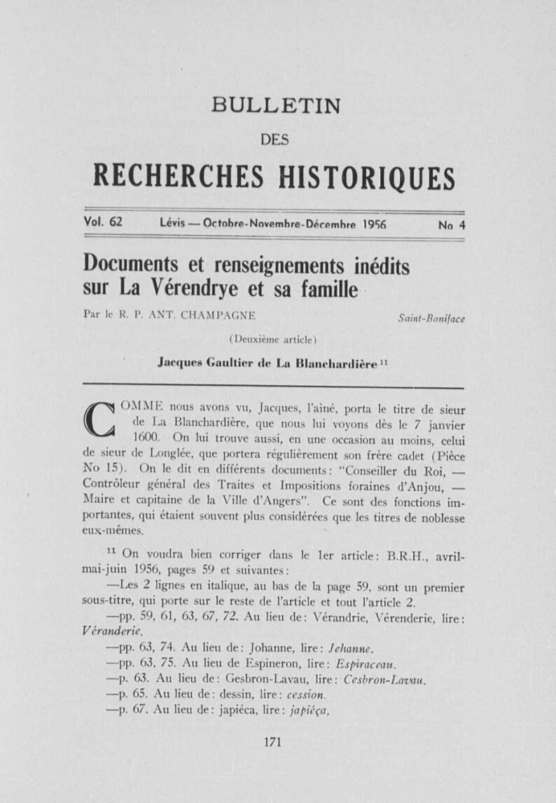“Documents et renseignements inédits sur La Vérendrye et sa famille”Ant. ChampagneTexteBulletin des recherches historiques : bulletin d'archéologie, d'histoire, de biographie, de numismatique, etc. /, 1956-10, Collections de BAnQ.https://numerique.banq.qc.ca/patrimoine/details/52327/2657613Trois-Rivières (avant le 1er janvier 2002)https://troisrivieresnumerique.ca/documents/documents-et-renseignements-inedits-sur-la-verendrye-et-sa-famille/