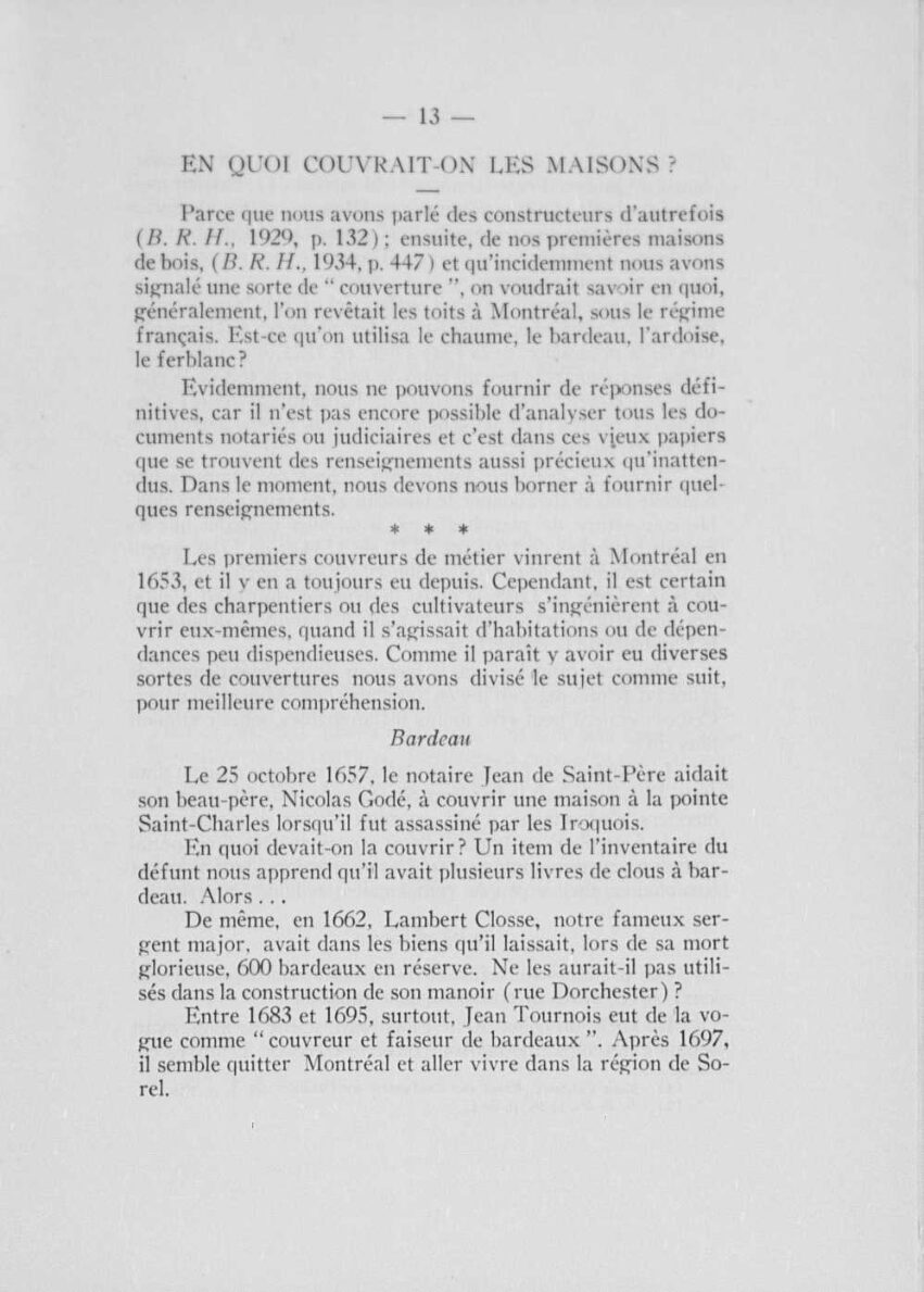 “En quoi couvrait-on les maisons?”E.Z. MassicotteTexteBulletin des recherches historiques : bulletin d'archéologie, d'histoire, de biographie, de numismatique, etc. /, 1938-01, Collections de BAnQ.https://numerique.banq.qc.ca/patrimoine/details/52327/2657449Trois-Rivières (avant le 1er janvier 2002)https://troisrivieresnumerique.ca/documents/en-quoi-couvrait-on-les-maisons/