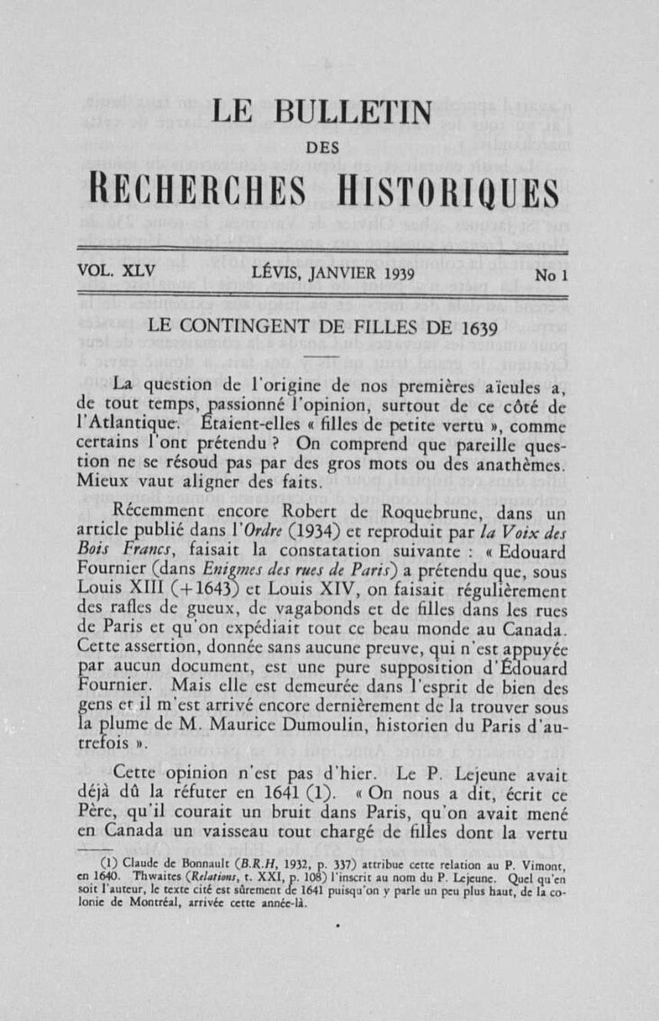 “Le contingent de filles de 1639”TexteBulletin des recherches historiques : bulletin d'archéologie, d'histoire, de biographie, de numismatique, etc. /, 1939-01, Collections de BAnQ.https://numerique.banq.qc.ca/patrimoine/details/52327/2657461Trois-Rivières (avant le 1er janvier 2002)https://troisrivieresnumerique.ca/documents/le-contingent-de-filles-de-1639/