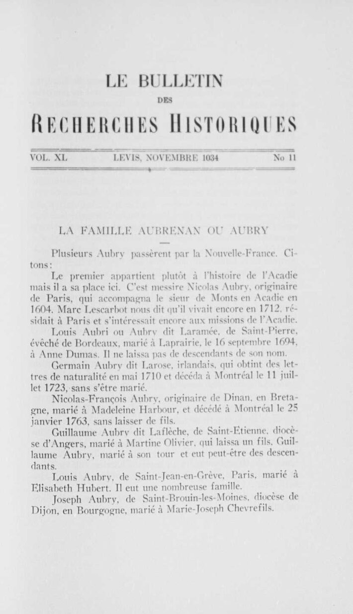 “La famille Aubrenan ou Aubry”TexteBulletin des recherches historiques : bulletin d'archéologie, d'histoire, de biographie, de numismatique, etc. /, 1934-11, Collections de BAnQ.https://numerique.banq.qc.ca/patrimoine/details/52327/2657411https://troisrivieresnumerique.ca/documents/la-famille-aubrenan-ou-aubry/