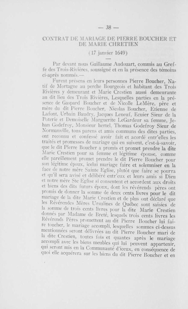 “Contrat de mariage de Pierre Boucher et de Marie Chrétien”TexteBulletin des recherches historiques : bulletin d'archéologie, d'histoire, de biographie, de numismatique, etc. /, 1934-01, Collections de BAnQ.https://numerique.banq.qc.ca/patrimoine/details/52327/2657401Trois-Rivières (avant le 1er janvier 2002)https://troisrivieresnumerique.ca/documents/contrat-de-mariage-de-pierre-boucher-et-de-marie-chretien/