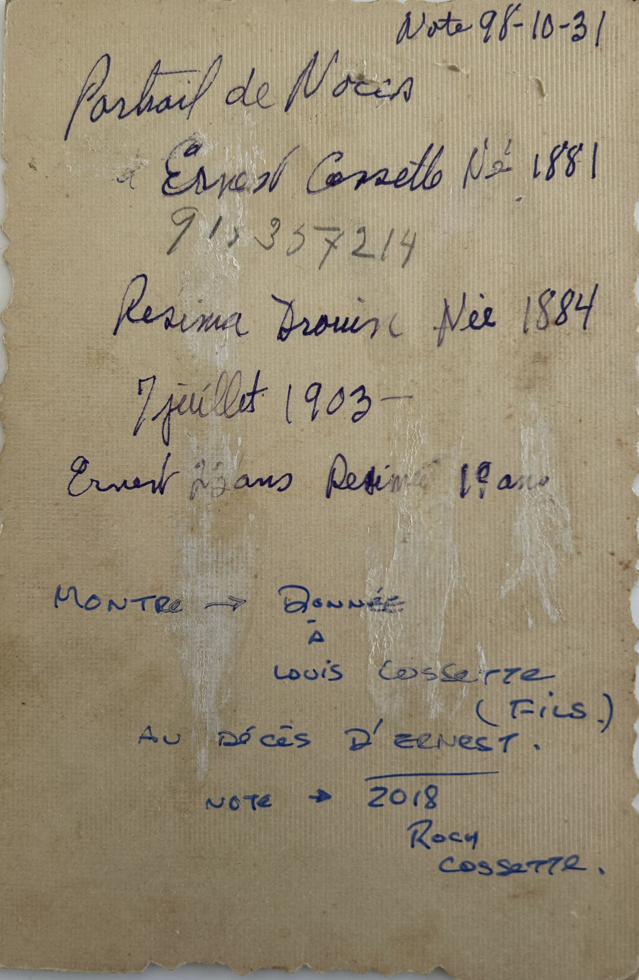 "Portrait de Noces. Ernest Cossette né 1881, Résima Drouin, née 1884, 7 juillet 1903. Ernest 23 ans, Résima 19 ans. Montre - Donnée à Louis Cossette (fils) au décès d'Ernest. Note 2018 Roch Cossette".
